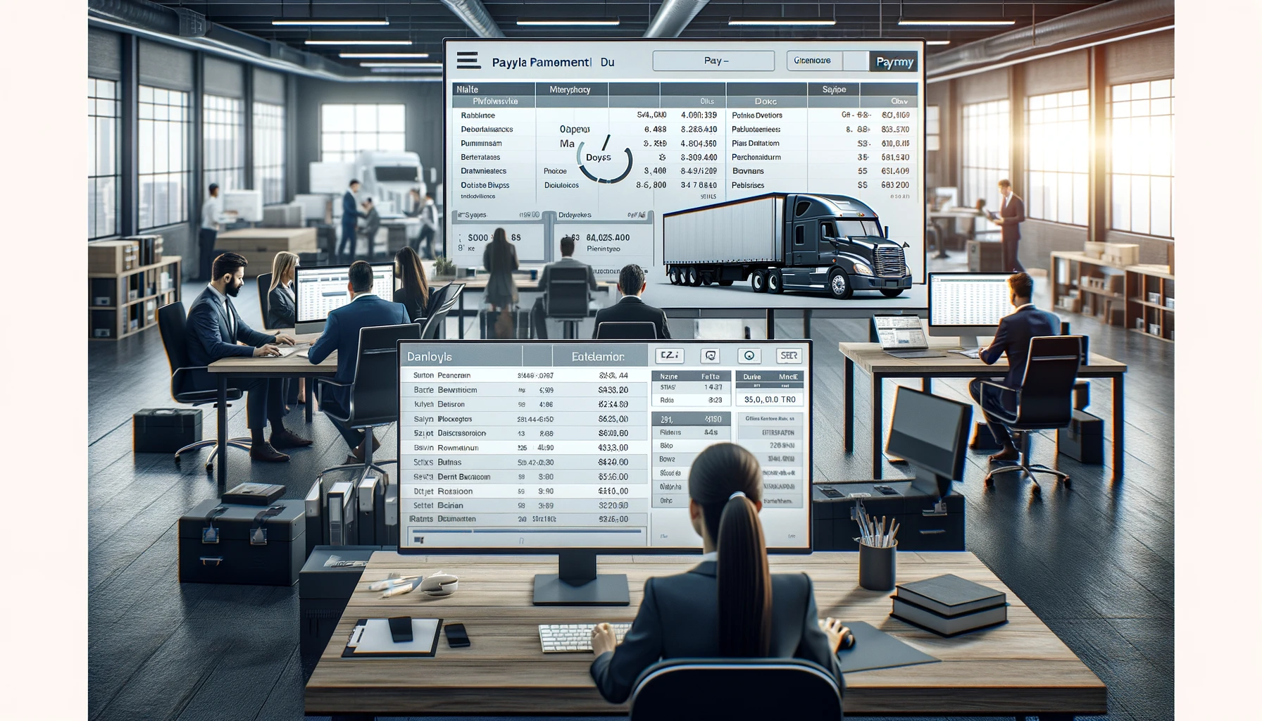 DALL路E 2024-06-07 14.14.09 – A realistic office environment where a team of professionals is using a software interface for payroll and payment management for truck drivers. The s